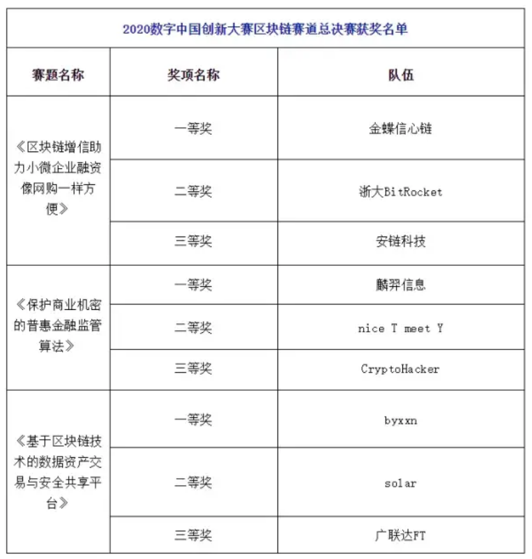 2020年10月13日,2020數(shù)字中國創(chuàng)新大賽總決賽在福州海峽國際會展中心成功舉辦。歷時5個月的賽事角逐,經(jīng)過線上線下幾輪激烈比拼。最終,來自金蝶云蒼穹區(qū)塊鏈平臺的“金蝶信心鏈”項目榮獲區(qū)塊鏈賽道一等獎,成為本屆大賽“區(qū)塊鏈增信助力小微企業(yè)融資像網(wǎng)購一樣方便”賽最具創(chuàng)意和應用價值的區(qū)塊鏈項目。