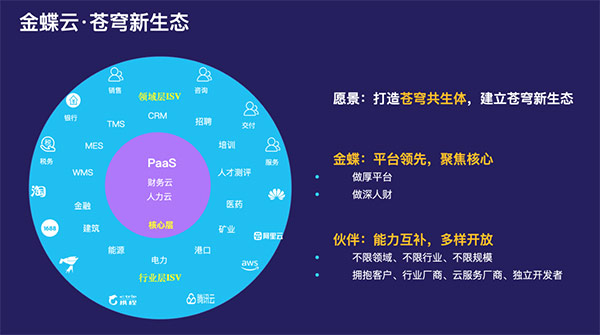 本屆蒼穹峰會上,金蝶發(fā)布了以蒼穹PaaS平臺為核心的生態(tài)戰(zhàn)略,秉承“平臺+生態(tài)”戰(zhàn)略,金蝶向全球征集基于蒼穹平臺的ISV合作伙伴、IaaS合作伙伴、咨詢合作伙伴,并攜手客戶共商、共建、共享生態(tài)體系。金蝶云·蒼穹始終關注吸引有行業(yè)競爭力的伙伴加入,目前蒼穹應用市場已入駐生態(tài)伙伴總數(shù)超過200家。蒼穹以分布式架構(gòu)的彈性伸縮能力,大幅提升可靠性與性能;基于金蝶動態(tài)領域模型架構(gòu)的低代碼開發(fā)平臺,可以讓ISV開發(fā)者效率提升500%以上;并提供豐富的微服務和AP,讓ISV伙伴可以最大限度利用平臺的開放能力。