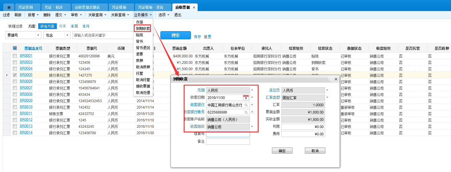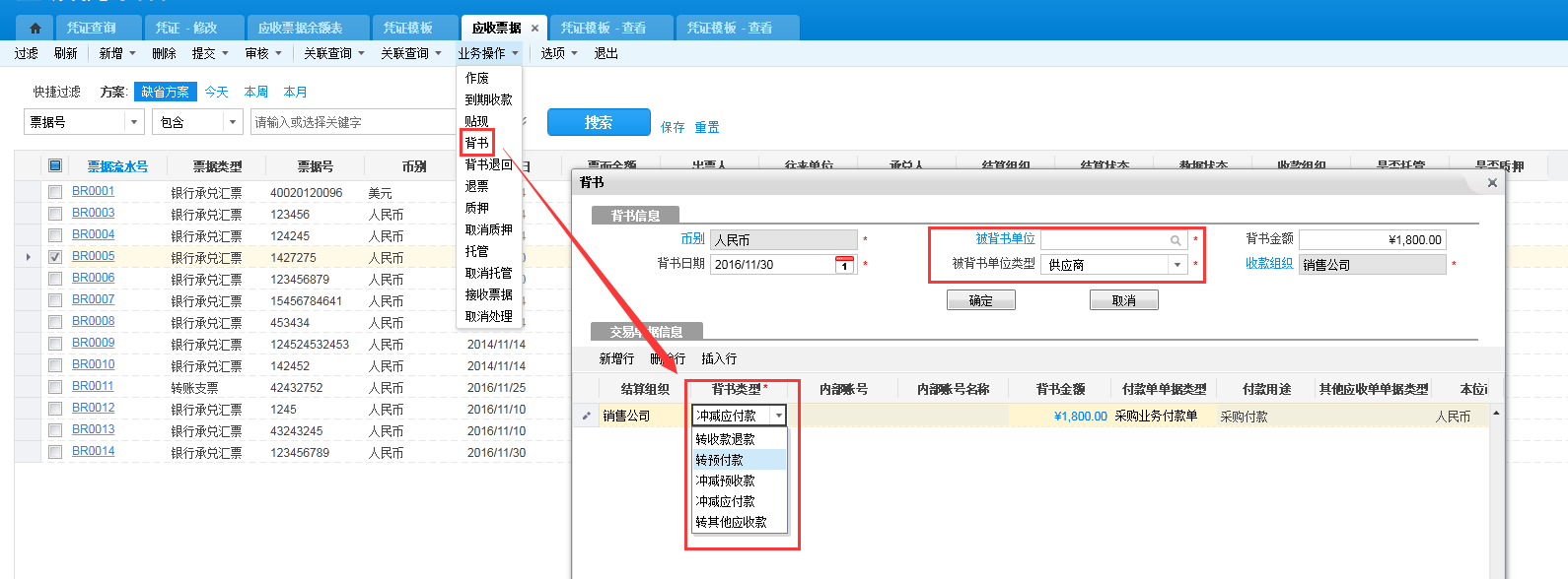 9、應收票據(jù)的背書、背書退回、退票等操作需要考慮結算組織與收款組織是否一致,以上均是在結算組織與收款組織一致下生成的憑證情況,若不同會有其他應收/其他應付科目處理結算組織與收款組織之間的往來;