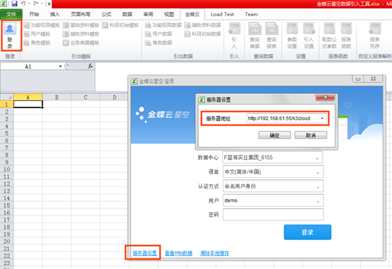 第三步:在【金蝶云】頁(yè)簽點(diǎn)擊【登陸】按鈕登陸系統(tǒng)(登陸前需要先設(shè)置好服務(wù)器地址)。