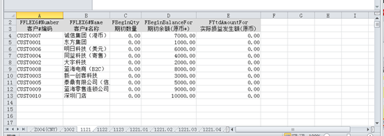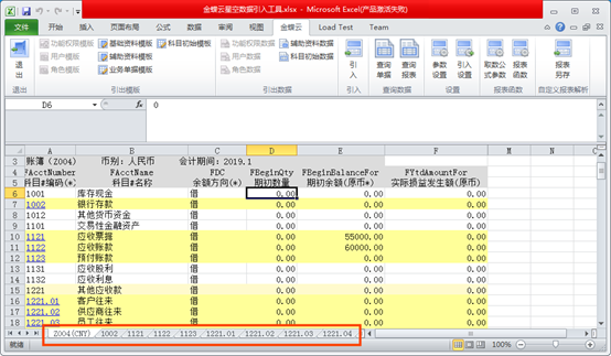 引出后科目初始數(shù)據(jù)顯示在第一個(gè)工作表,并分科目顯示核算維度初始數(shù)據(jù)。
