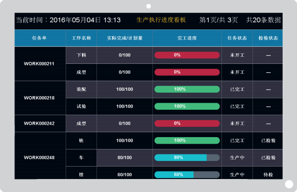 ●通過觸摸屏工作臺實現生產指令的即時下達、傳遞,任務/圖紙的即時查看、快速報工、檢驗等,實現生產過程數據信息化、即時化;